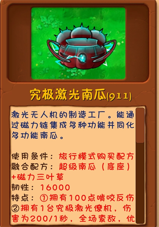 核心能力:拥有16000点韧性和100点啃咬反伤,自带1台究极激光摄像机,以200/1秒的伤害全场索敌,是激光无人机的制造工厂。