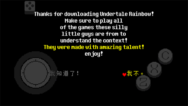 总的来说,《地域传说彩虹汉化手机版》颠覆了传统的战斗系统,允许玩家选择饶恕而非杀戮,与所有BOSS成为朋友。每个选择都能深刻影响故事走向,带来和平或屠杀等多种结局。复古像素风格搭配满分原声,虽然看似简陋,却凭借极富魅力的角色和幽默且深刻的故事吸引了众多玩家。