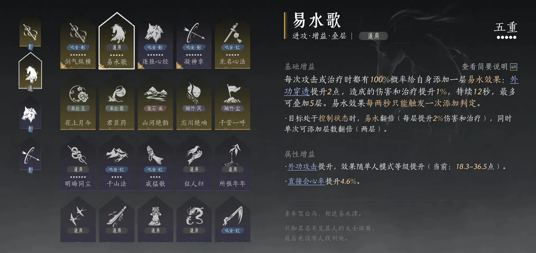 而在心法的选择上,都是1本自身流派金+1本通用金易水歌,再加1本自身流派紫,最后一本按自己的喜好和理解带。