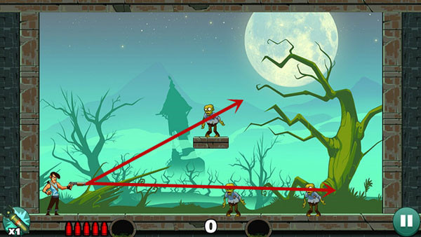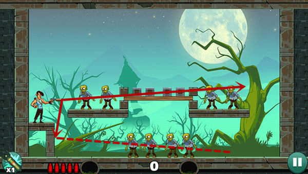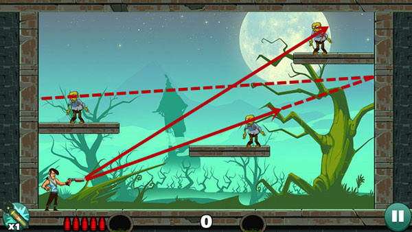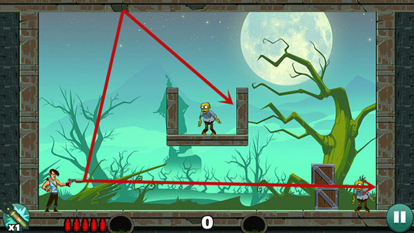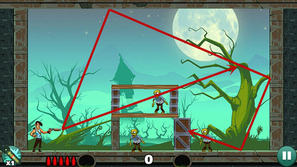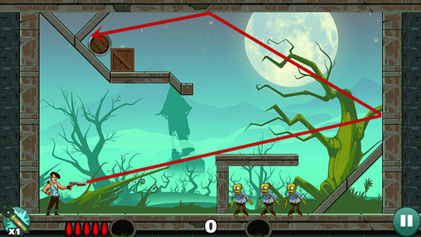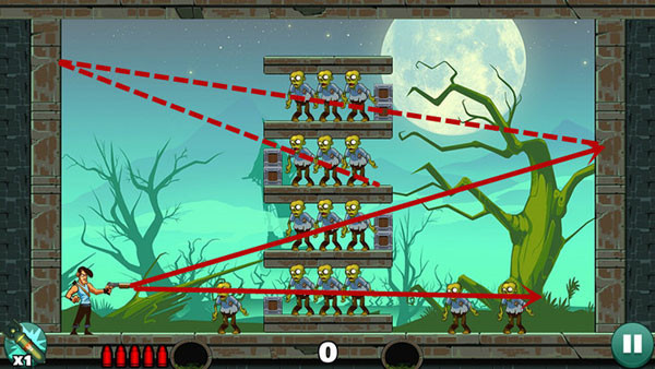 操作相对轻松,底部僵尸可以用直线射击解决,上方敌人则借助墙面反射来命中,角度不熟时多尝试几次即可掌握。