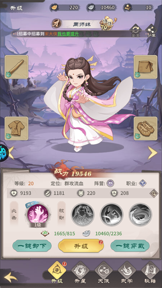 资源优先升级主力侠客,同时点满天赋和武学,解锁群攻技能后推图效率会大幅提升。
