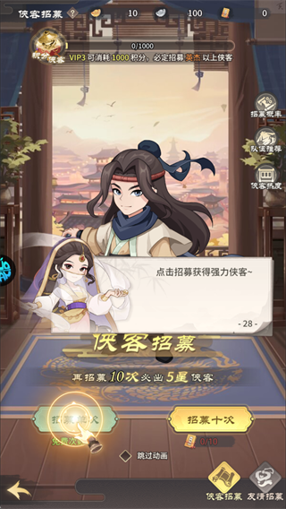 用登录送的千抽券优先单抽,攒够保底次数再十连,VIP3还能消耗积分必出英杰以上侠客。