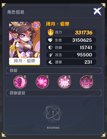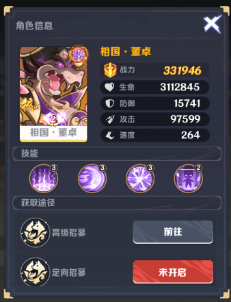 阵容组成:虎将·孙策+闭月·貂蝉+相国·董卓+武乡侯·诸葛亮+博昌候·夏侯渊