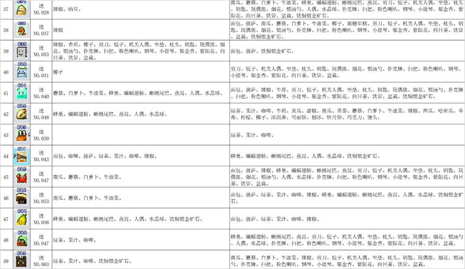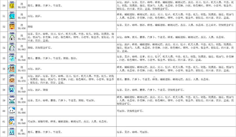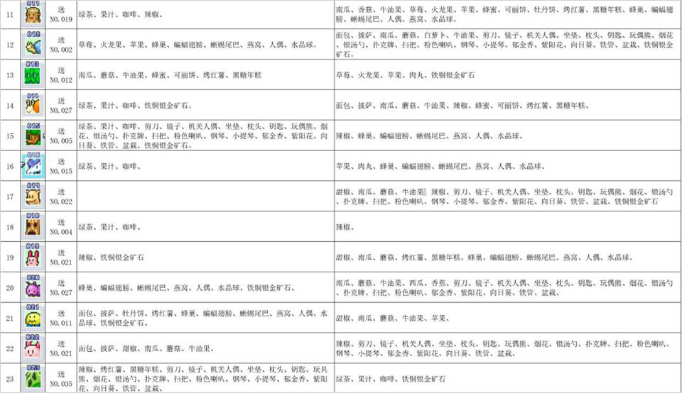 21"送 NO.011"面包、披萨、牡丹饼、烤红薯、蜂巢、蝙蝠翅膀、蜥蜴尾巴、燕窝、人偶、水晶球、铁铜银金矿石、,喜欢的道具(不全):甜椒、南瓜、蘑菇、牛油果、苹果、