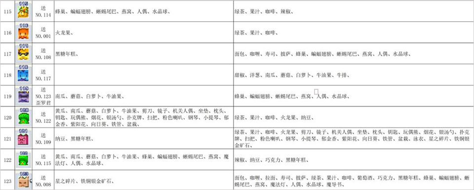 122"送 NO.115"黄瓜、南瓜、蘑菇、白萝卜、牛油果、蜂巢、蝙蝠翅膀、蜥蜴尾巴、燕窝、魔法灯、人偶、水晶球、,喜欢的道具(不全):辣椒、纳豆、巧克力、黑糖年糕、