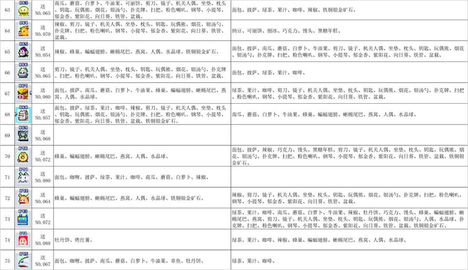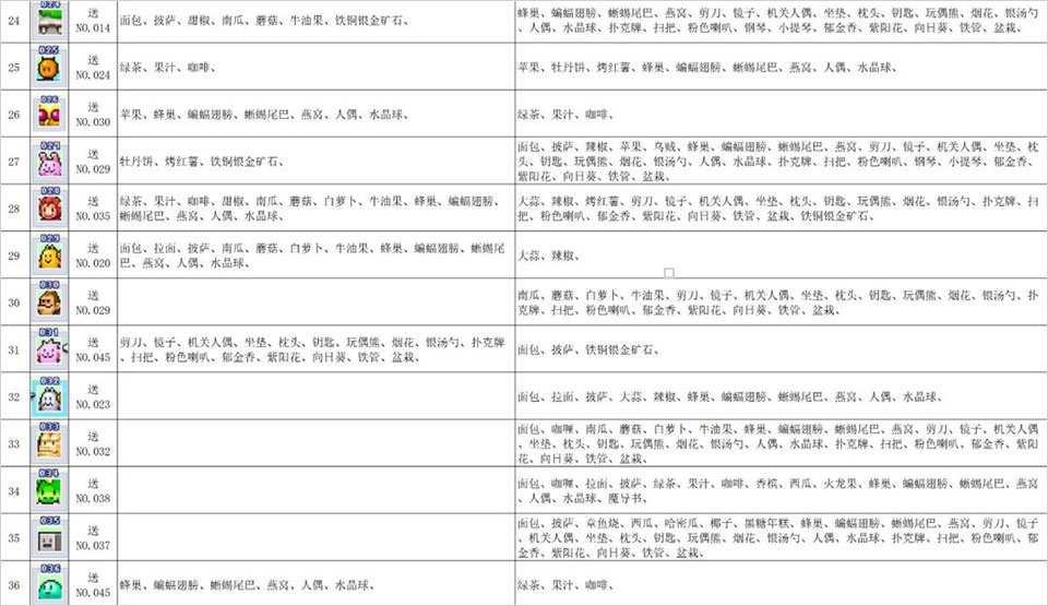 3"送 NO.001"甜椒、土豆、南瓜、番茄、蘑菇、白萝卜、牛油果、蜂蜜、冰淇淋、可丽饼、甜甜圈、饼干、刨冰、牡丹饼、烤红薯、黑糖年糕、,喜欢的道具(不全):绿茶、果汁、咖啡、香槟、西瓜、哈密瓜、草莓、橙子、火龙果、香蕉、菠萝、柠檬、苹果、牛排、肉丸、蜂巢、蝙蝠翅膀、蜥蜴尾巴、燕窝、剪刀、镜子、机关人偶、坐垫、枕头、钥匙、玩偶熊、烟花、银汤勺、魔法灯、人偶、水晶球、扑克牌、扫把、粉色喇叭、钢琴、小提琴、郁金香、紫阳花、向日葵、铁管、盆栽、泳衣、铁铜银金矿石、
