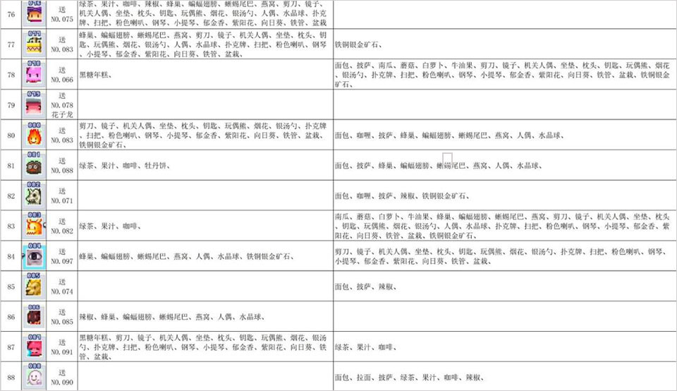 121"送 NO.109"纳豆、黑糖年糕、,喜欢的道具(不全):绿茶、果汁、咖啡、火龙果、剪刀、镜子、机关人偶、坐垫、枕头、钥匙、玩偶熊、烟花、银汤勺、扑克牌、扫把、粉色喇叭、钢琴、小提琴、郁金香、紫阳花、向日葵、铁管、盆栽、泳衣、星之碎片、铁铜银金矿石、