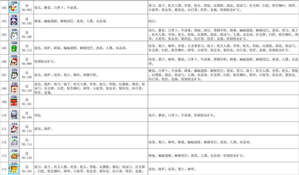 104"送 NO.106",喜欢的道具(不全):南瓜、蘑菇、白萝卜、牛油果、辣椒、纳豆、黑糖年糕、蜂巢、蝙蝠翅膀、蜥蜴尾巴、燕窝、剪刀、镜子、机关人偶、坐垫、枕头、钥匙、玩偶熊、烟花、银汤勺、人偶、水晶球、扑克牌、扫把、粉色喇叭、钢琴、小提琴、郁金香、紫阳花、向日葵、铁管、盆栽、铁铜银金矿石、