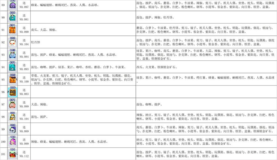 94"送 NO.093"面包、咖喱、披萨、绿茶、果汁、咖啡、香槟、蘑菇、白萝卜、牛油果、,喜欢的道具(不全):西瓜、火龙果、铁铜银金矿石、