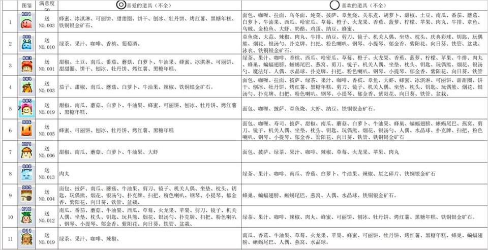 1"送 NO.003"蜂蜜、冰淇淋、可丽饼、甜甜圈、饼干、刨冰、牡丹饼、烤红薯、黑糖年糕、铁铜银金矿石、,喜欢的道具(不全):面包、咖喱、拉面、乌冬面、炖菜、披萨、章鱼烧、关东煮、胡萝卜、甜椒、土豆、南瓜、番茄、蘑菇、白萝卜、牛油果、西瓜、哈密瓜、草莓、橙子、火龙果、香蕉、菠萝、柠檬、苹果、肉丸、牛排、章鱼、乌贼、金枪鱼、大虾、奶酪、鸡蛋、纳豆、蜂蜜、