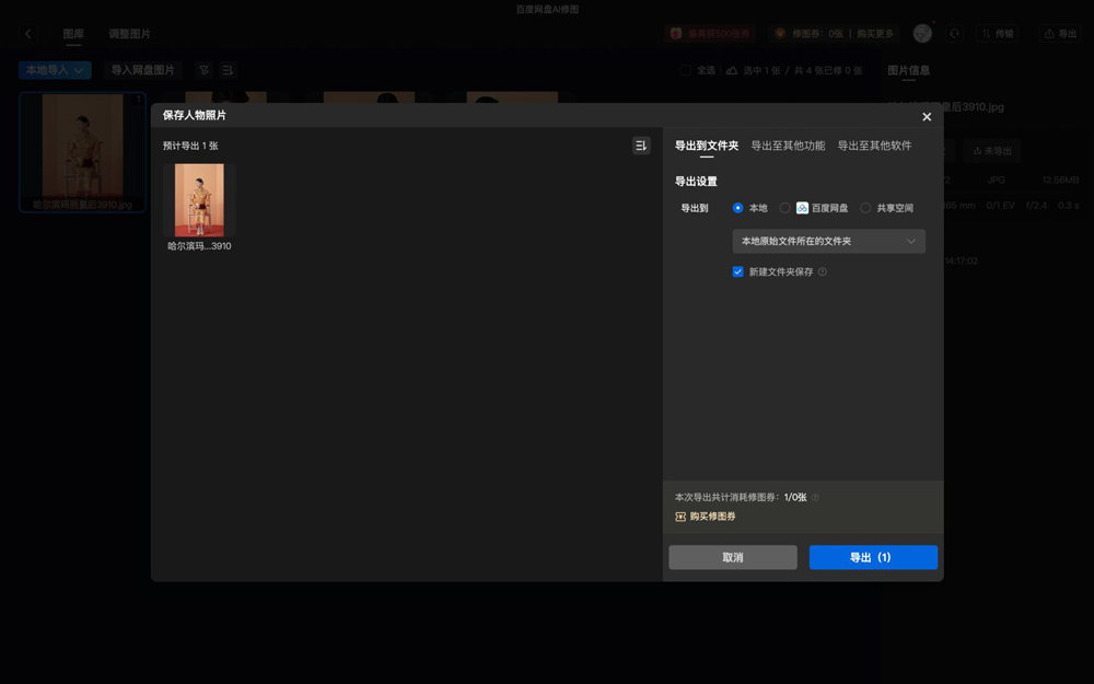点击「导出」将选择的图片导出至本地/百度网盘/共享空间。