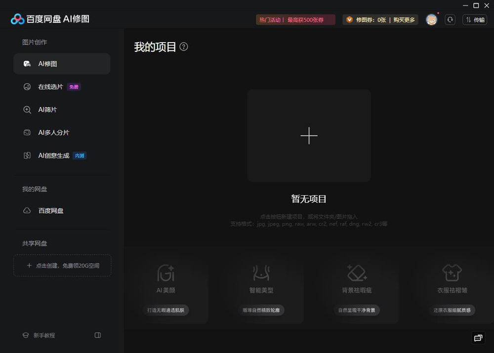 在左侧功能导航栏,切换到“AI修图”功能上。您有2种方式可以新建一个AI修图项目: