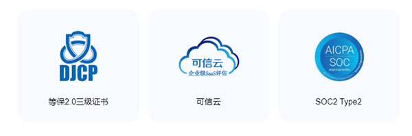 获得等保2.0三级证书、可信云、SOC2 Type2等专业认证,安全实力得到广泛认可