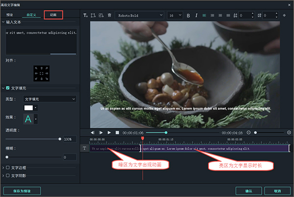 设置文字动画出入点,暗区为文字出现动画范围,亮区为文字显示范围,如果将出入点拉至整个时长为亮区,将无文字逐渐出现的动画效果。