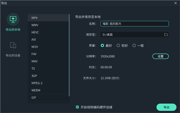 要将视频导出到本地,首先单击导出按钮,然后选择“本地选项卡”,选择需要导出的格式。目前万兴喵影支持以下格式:MP4,WMV,AVI,MOV,F4V,MKV,TS,3GP,MPG-2,WEBM,GIF和MP3。
