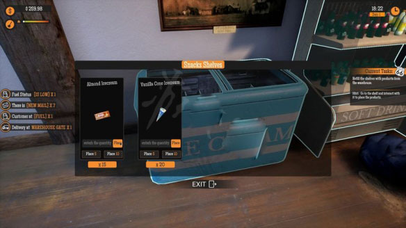如上所述,你还需要关注产品供应,不仅仅是燃油供应。你可不想卖光了可卖的商品。在产品价格最低的时候进货是非常重要的,也是非常精明的。在那之后,打开包装,把它们放在你的仓库里,然后在你的商店里展示,以便出售它们。