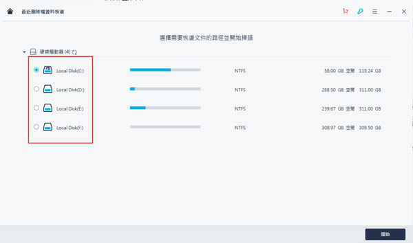 2、选择需要恢复的盘后单击右下角开始。