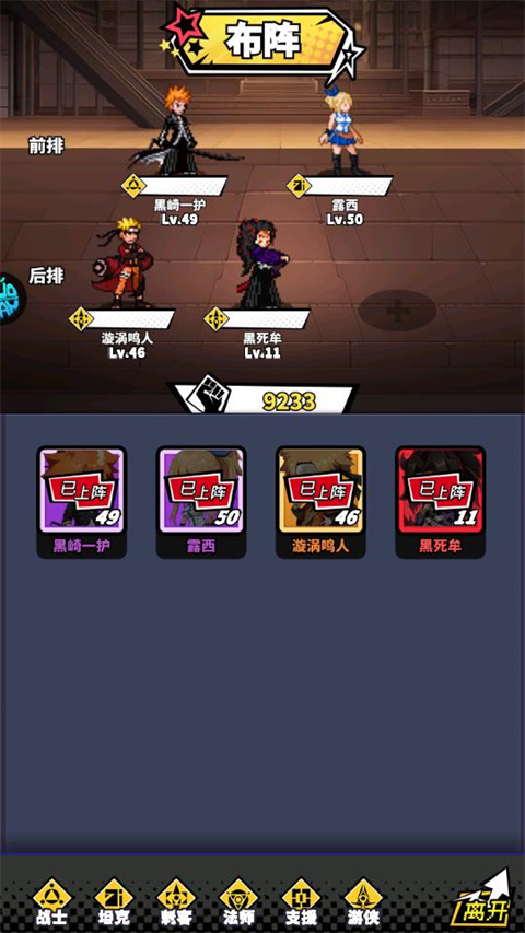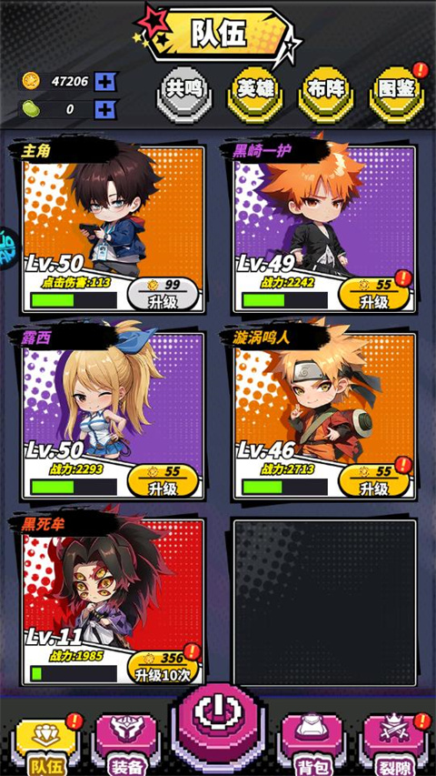 3、通过领取系统提供新手奖励后,就能获得漩涡鸣人,日番谷冬狮郎。再通过活动领取赠送的次元门抽取5星强力输出或者坦克,以上英雄,挑选进行升级和搭配,就能满足前期的副本需求。
