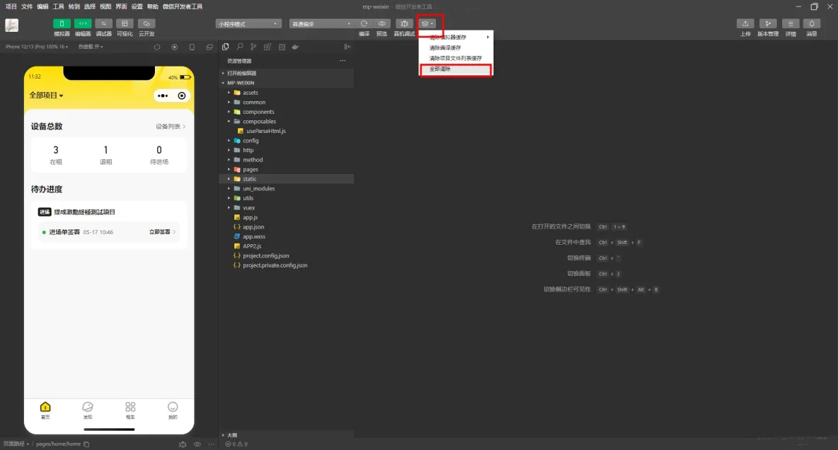 8、还可以进行缓存清理,以上就是微信开发者工具开发版真机调试的方法了。