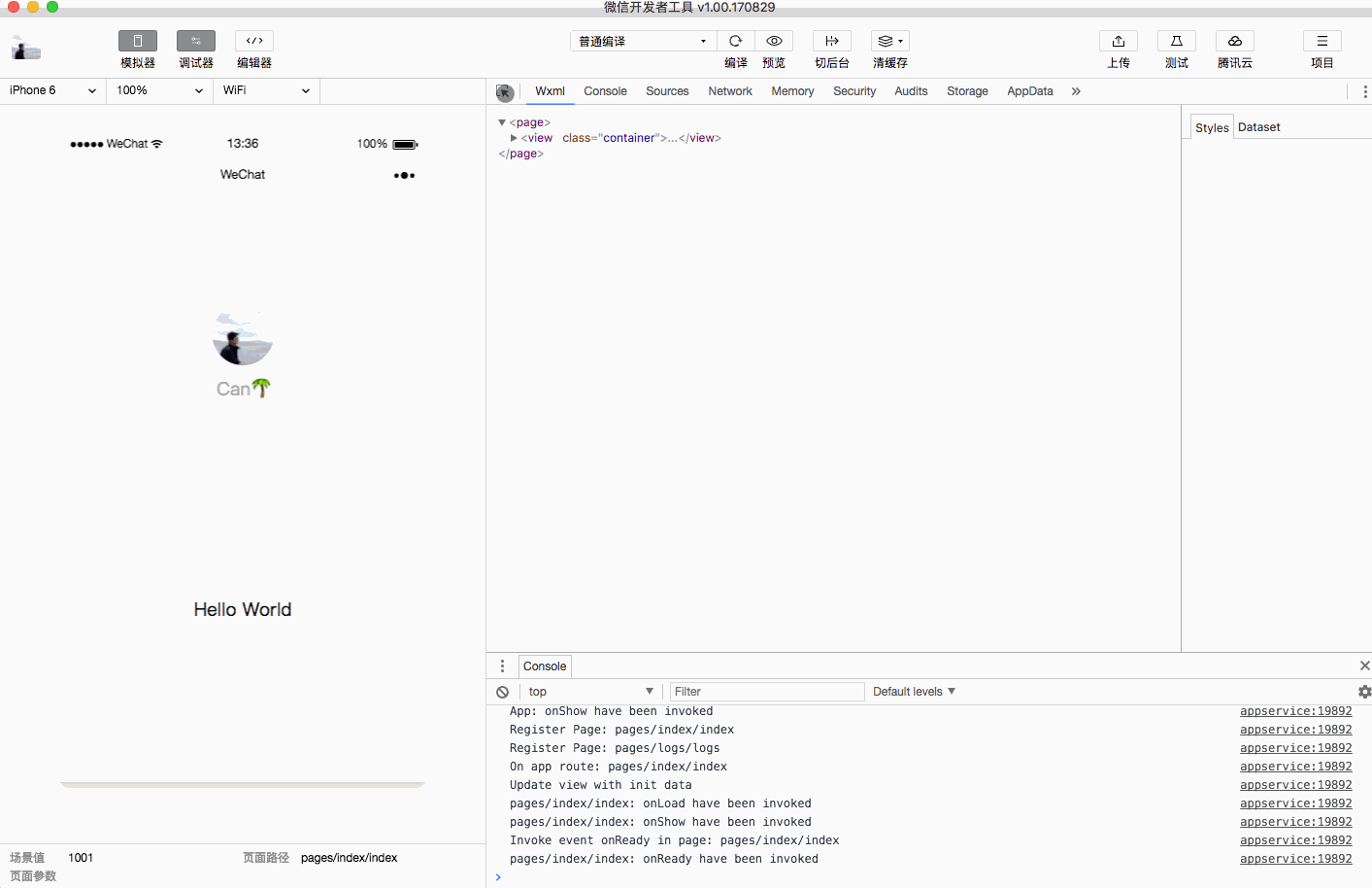 Wxml panel 用于帮助开发者开发 wxml 转化后的界面。在这里可以看到真实的页面结构以及结构对应的 wxss 属性,同时可以通过修改对应 wxss 属性,在模拟器中实时看到修改的情况(仅为实时预览,无法保存到文件)。通过调试模块左上角的选择器,还可以快速定位页面中组件对应的 wxml 代码。