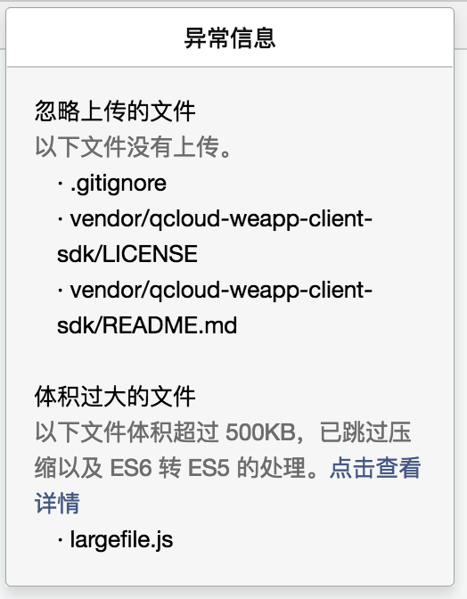 体积过大的文件:如果勾选了 ES6、 转 ES5 或代码压缩的选项,为了优化编译速度,对于某些体积很大的 JS 文件,工具会跳过对这些文件的处理。