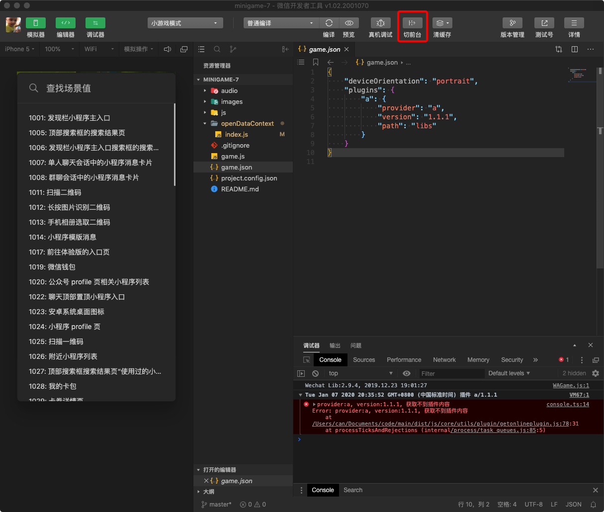 工具栏中前后台切换帮助开发者模拟一些客户端的环境操作。例如当用户从小程序中回到聊天窗口,会触发一个小程序被设置为后台的回调。