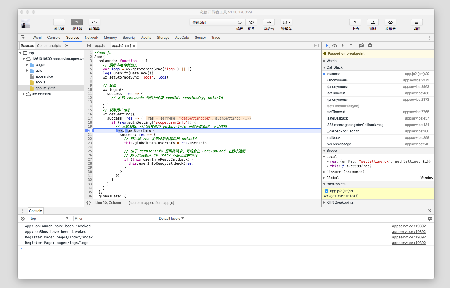 Sources panel 用于显示当前项目的脚本文件,同浏览器开发不同,微信小程序框架会对脚本文件进行编译的工作,所以在 Sources panel 中开发者看到的文件是经过处理之后的脚本文件,开发者的代码都会被包裹在 define 函数中,并且对于 Page 代码,在尾部会有 require 的主动调用。