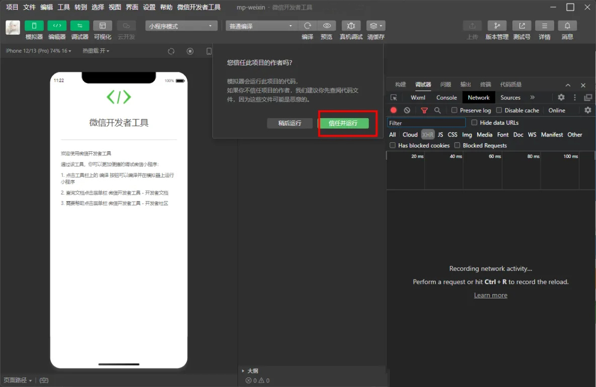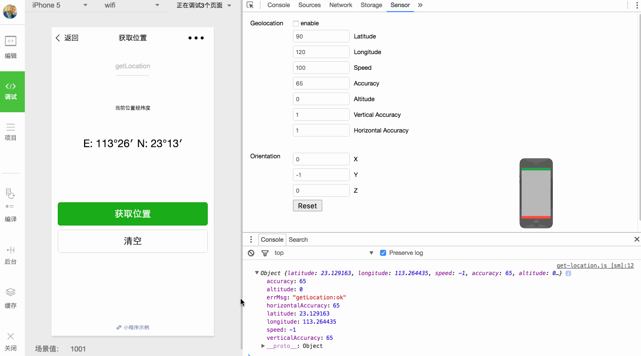 程序调试主要有三大功能区:模拟器、调试工具和小程序操作区