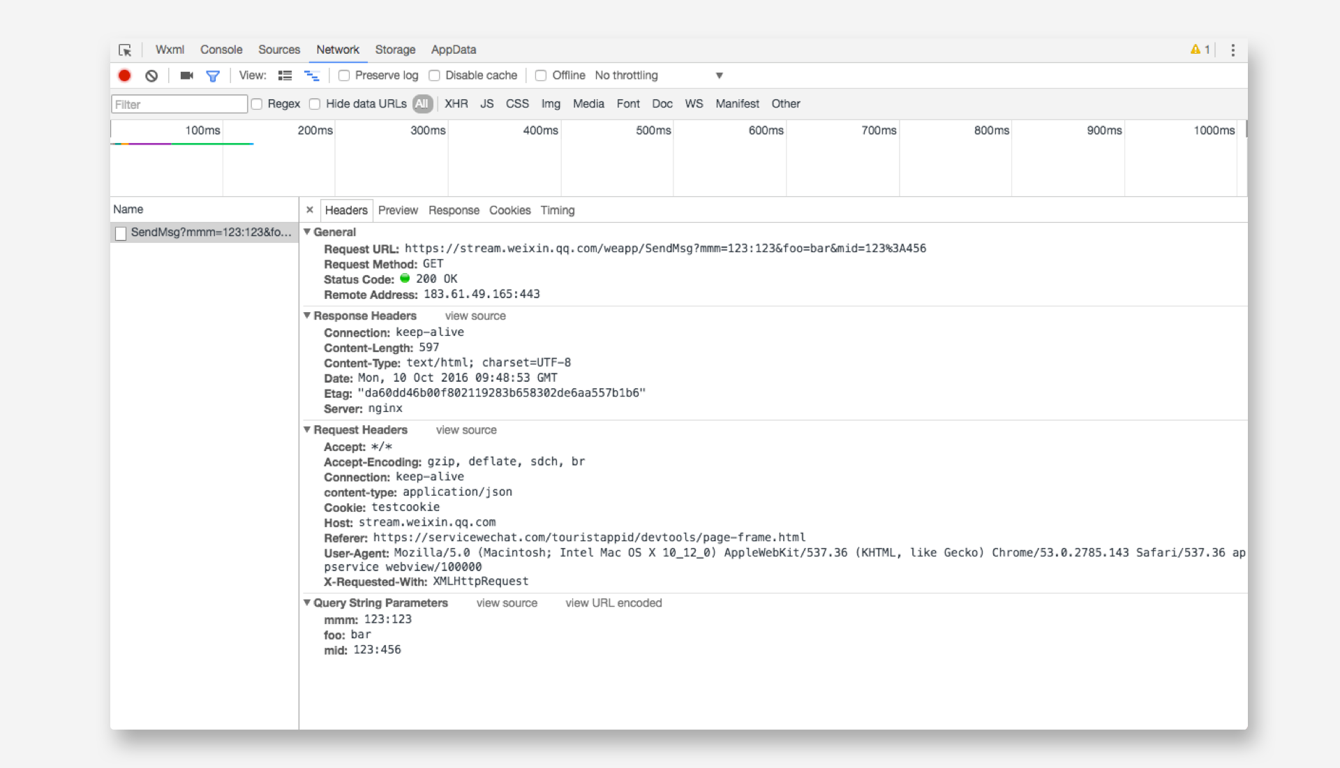 调试工具分为 7 大功能模块:Wxml、Console、Sources、Network、Appdata、Storage、Sensor、Trace