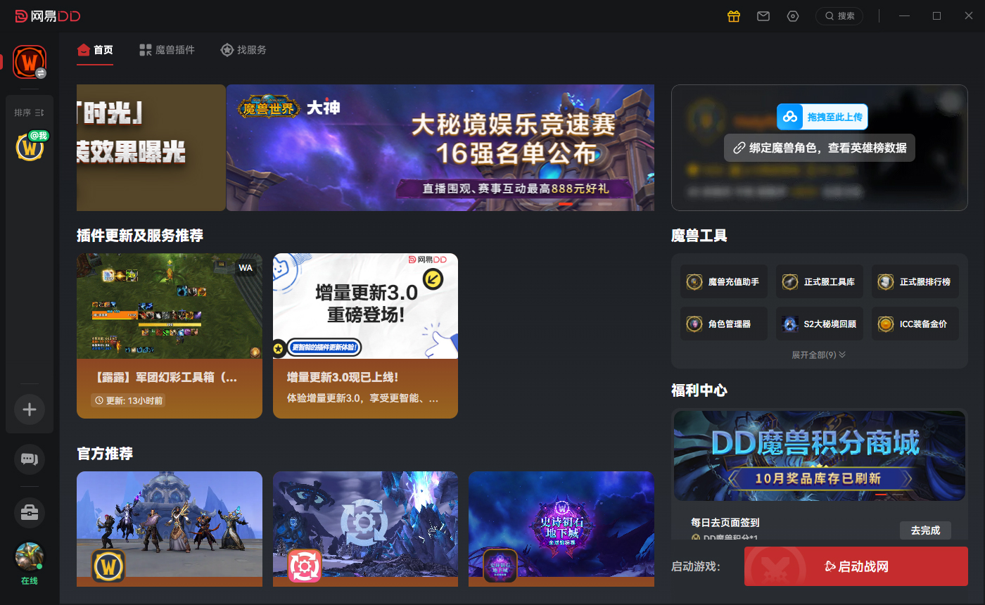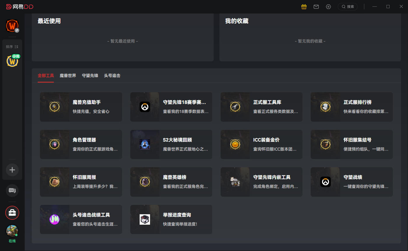 3、点击左下角工具箱:可以查看全部工具,包括魔兽充值助手,角色管理器,正式服工具库,正式服排行榜等;