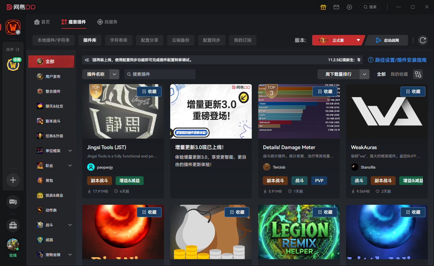 2、支持守望先锋,魔兽世界,头号追击,这里小编以魔兽世界为例,拥有魔兽插件、找服务等功能;