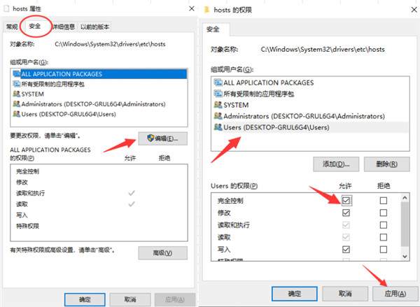 4、遇到输入#后无法保存,需要右键host的属性,选择安全-编辑-勾选完全控制的“允许”,点击应用即可重新保存host