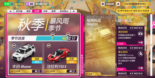 季完成有个进度条,达成进度条的特定分数标志,可以得到特殊的奖励,比如服装或者车辆奖励,特殊的车辆奖励可以大大的满足你的车辆收藏的欲望。季节赛就是你获取稀有车最重要的途径,季节赛是从夏季开始,春季结束,现实生活一个星期是游戏里的一个季节,每周4北京时间22点30分更新新的季节和季节赛。