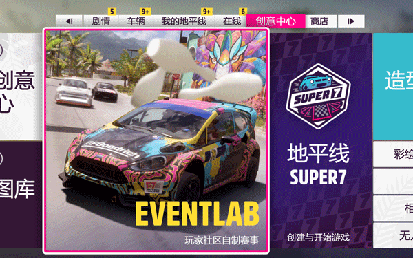 利用强大的全新 EventLab 游戏工具组展现自己对乐趣的想法,其中包含自定义比赛、挑战、特技赛和全新的游戏模式。全新选项可让您以前所未有的方式来改装您的车辆,如可以开启和关闭的敞篷、涂装刹车卡钳,以及更多功能。使用全新礼物掉落箱功能,来和社区共享您设计的创作。