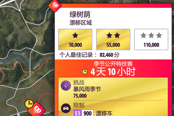 剩下的比赛就需要玩家单人完成的公开特技挑战赛,不过难度也都不高 ,比如在固定漂移区域用限定车挑战漂移分数, 如图: