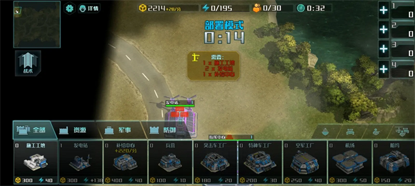 解锁建筑:施工工地上限1,发电站,补给中心,兵营上限3,突击车工厂上限1,船坞上限1,基础防御塔上限2,海上防御塔上限1