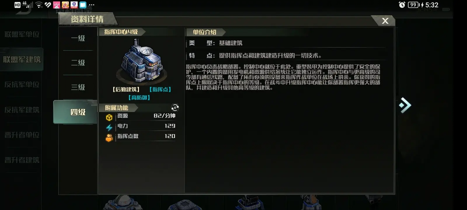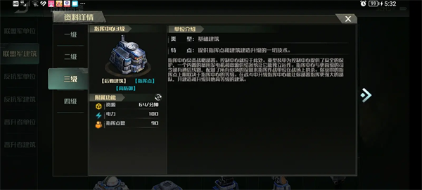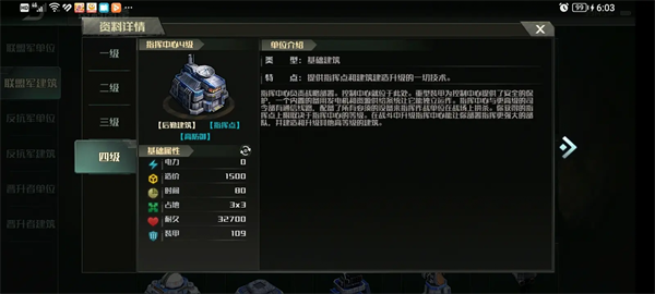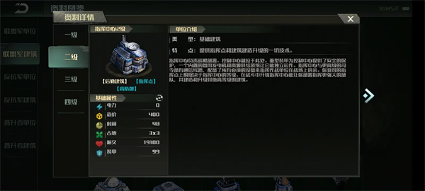 其他建筑生命值普遍偏少的反抗军都指挥中心却在1到3本比其他两个阵营要多,分别为:1本19100血,94甲
