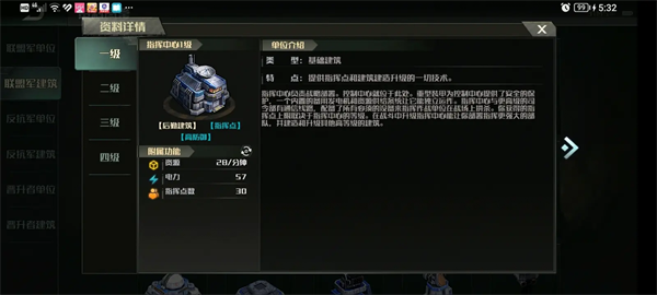 1级:提供:28资源/每分钟,提供电力57度,提供30点指挥点数。