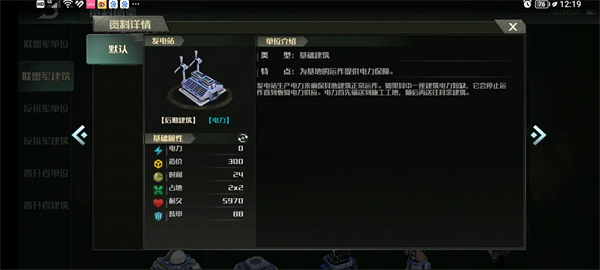 所有建筑都是Ill级甲(也就是游戏中的重型装甲)为了方便,游戏中的补给点统一都用(钱/资源)来表示,电力用(度)来表示,耐久用(生命/血)来表示