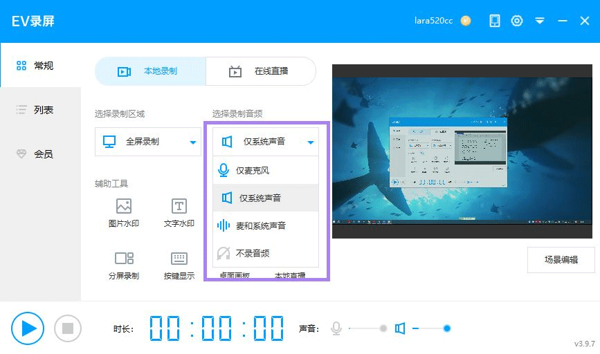 只录电脑播放的声音用「仅系统声音」,两者同时都需要录制的时候则选择「麦和系统声音」。