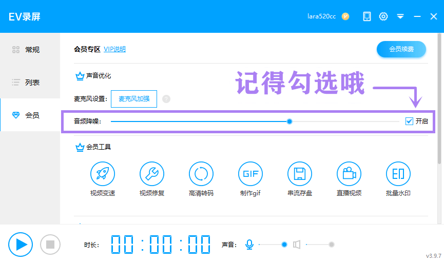 在EV录屏的会员栏中开通会员,即可使用会员功能专区的「音频降噪」