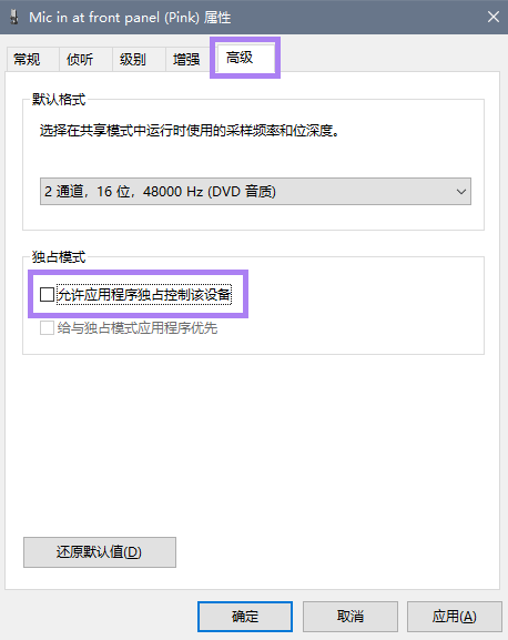 声音→录制→高级→,将「允许应用程序独占控制该设备」取消勾选。