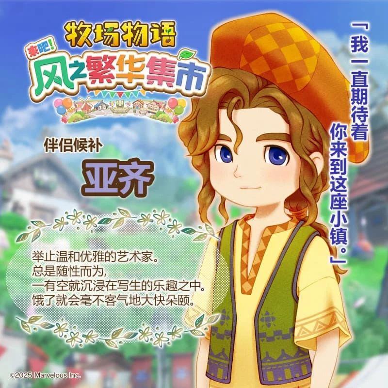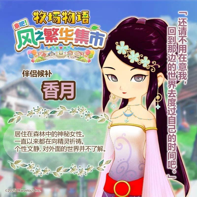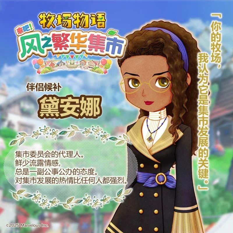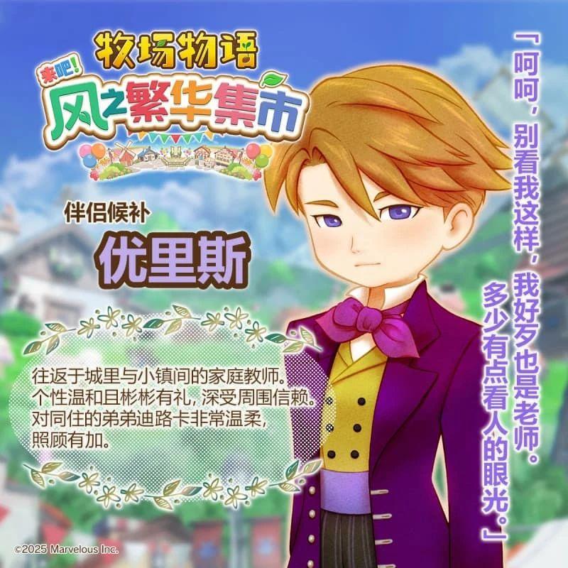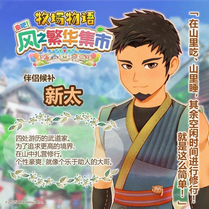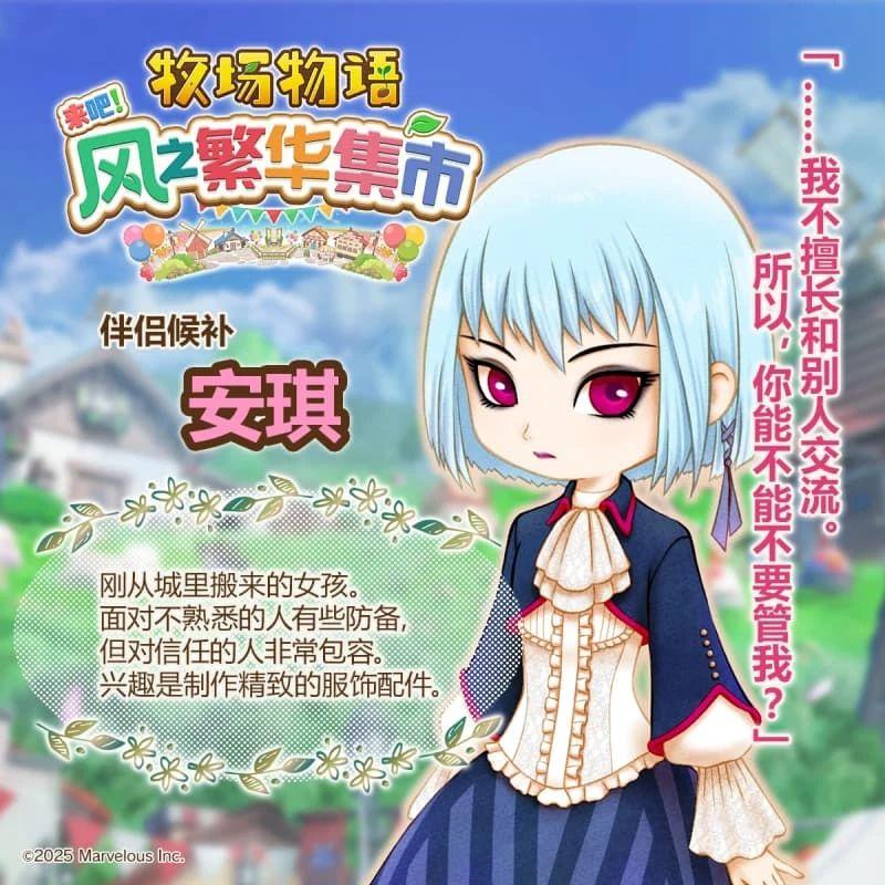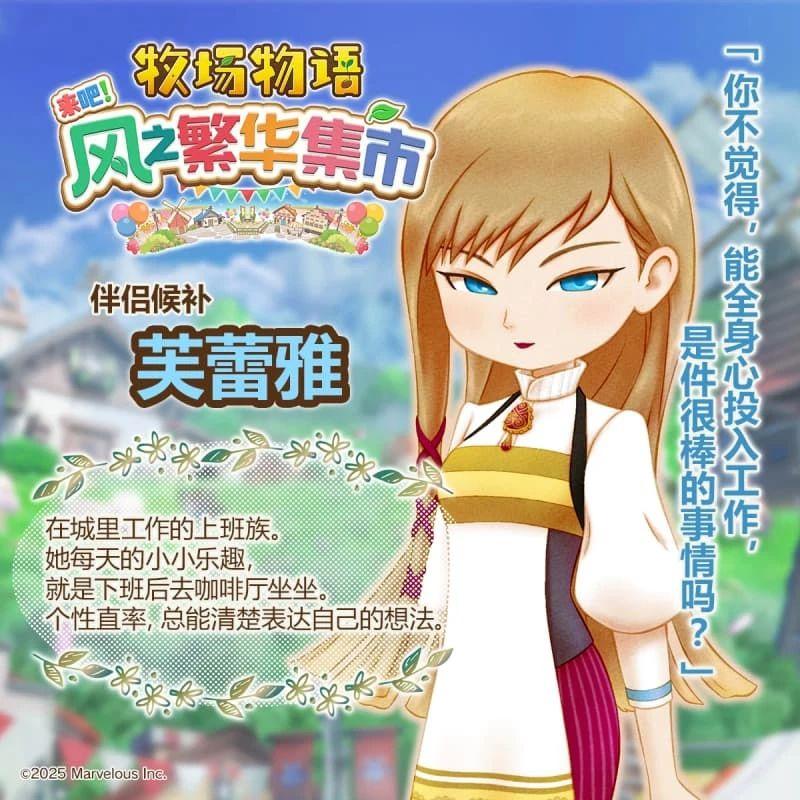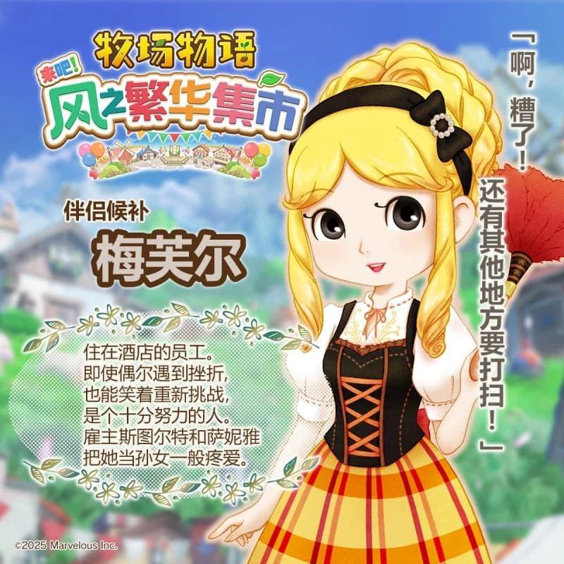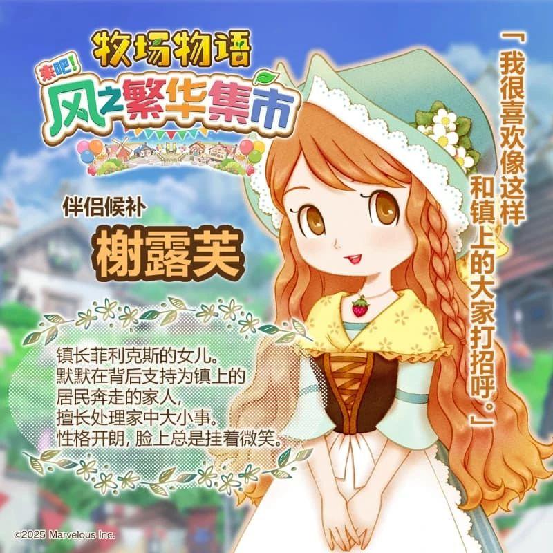 《牧场物语 来吧!风之繁华集市》中设置了 12 位迷人的伴侣候补角色,玩家可以与他们从日常互动到心动告白,最终步入婚姻,共度幸福的牧场生活。