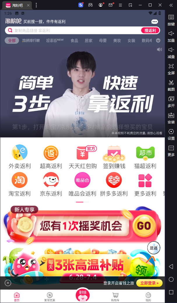 网购现在是许多年轻人的主要购物方式,大家总是想用最少的钱买到最好的商品。今天我要给大家介绍一款淘粉吧电脑版软件,它是一款基于安卓模拟器运行的购物返利平台。这个软件不仅能提供在线购物返利服务,还有9块9包邮、天天爆款、品牌特卖、今日必抢等特色功能,听起来就觉得很实用!