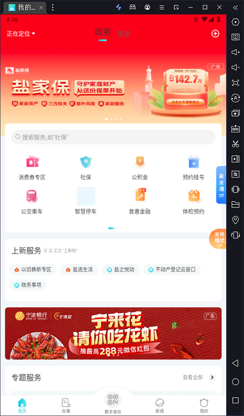 1、首先在电脑模拟器上安装好在本站下载的软件安装包,然后用户进入软件首页处点击“社保”,进入社会保障服务专区