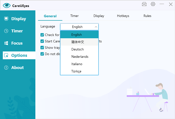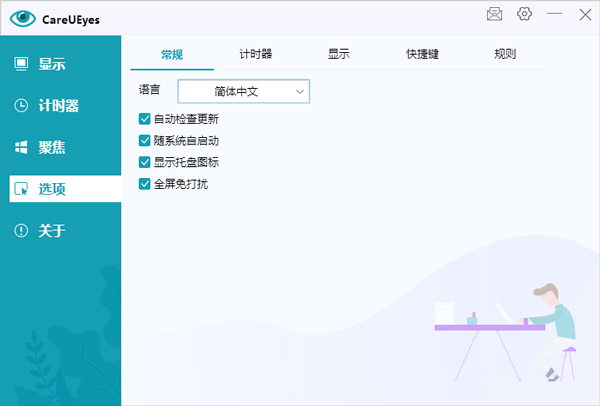双击运行"CareUEyes_内置补丁。exe"程序,即可直接打开软件,进入OPtions界面,选择简体中文语言;