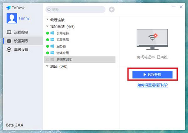 2、您要开机的电脑设备在同一交换机(路由器下),需要有另外一个ToDesk端在运行.比如其他的电脑或手机, iPad, Android电视盒子, 或家人的手机安装一个ToDesk,这样您就可以在千里之外为您的电脑进行远程开机操作,当电脑关机时,即可 通过 电脑端 或 ToDesk 手机APP 对电脑 使用 远程开机功能,对设备进行开机操作。