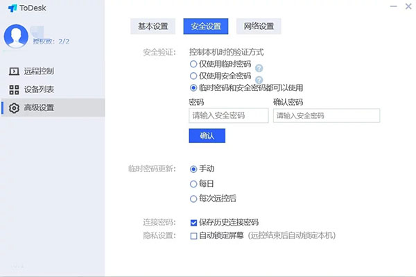 在界面中提供远程控制、设备列表、高级设置等功能,有需求的朋友可以在高级设置中进行个性化的设置,例如设置安全密码、设置开机自启动(无人值守时需要用到这功能)、远控后自动锁屏等等,在安全方面ToDesk做的还是让人很放心的,用户可以大胆使用。
