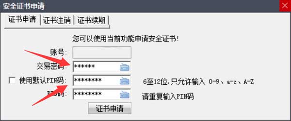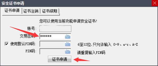(2)点击“认证方式”右侧进入证书申请界面,输入交易密码并点击“证书申请”。