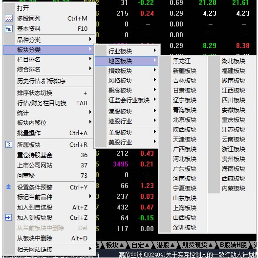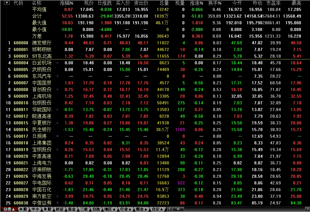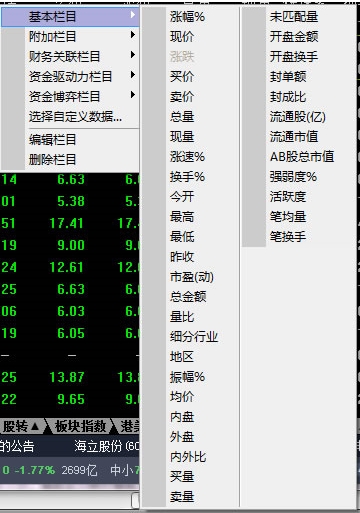 要想更换某一栏的内容,请用鼠标右键点击其栏目名称,然后从弹出菜单上选择新栏目。例,右键点击『现价』栏,弹出菜单后,找到『市盈率』,左键点击它,则该栏目内容换成市盈率。